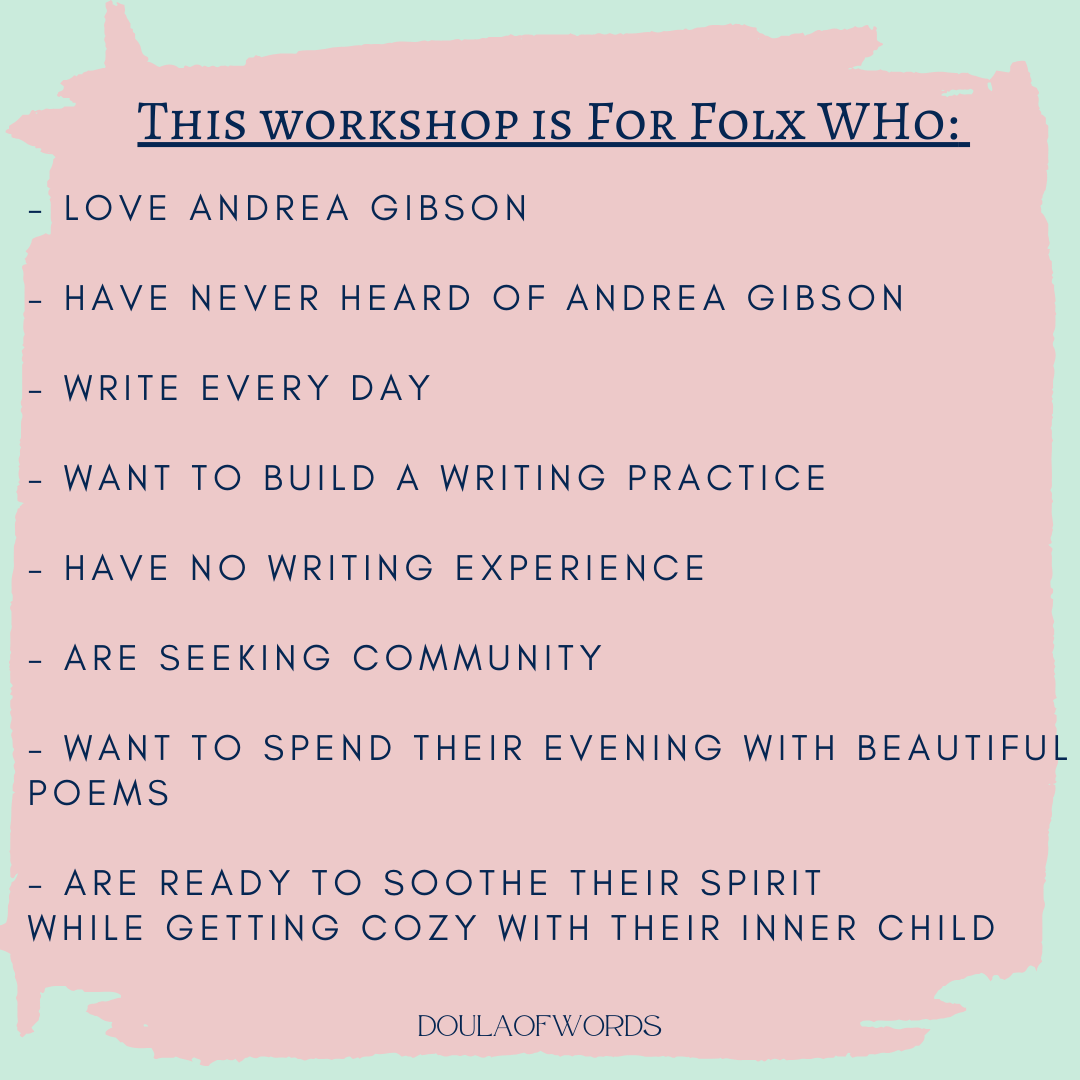 Like all writing circles with Doula of Words, this workshop is a safe, generative, welcoming, and warm environment, which is open to all. You don't have to be a published/experienced writer or be working on something specific to find a home with us. This workshop is meant to be taken at your own pace. Each week, for five weeks, I will be sending you poems, giving thoughtful prompts, and creating a container for all who attend to listen and share as much as they wish. (For more information on writing circles with The Doula of Words, or if you’re wondering if this space is for you, please read this!)